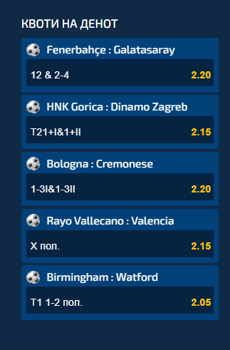 Прво „на удар“ е големото истанбулско и турско дерби помеѓу Фенербахче и Галатасарај, се предлага квота од 2.20 за играта дека ќе има победник, и ќе паднат 2-4 гола на натпреварот.