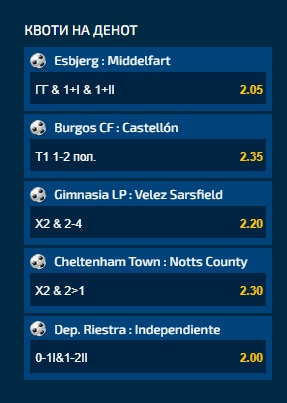 Првиот предлог е мечот Есбјерг – Миделфарт и квотата на денот е 2.05 доколку двете екипи постигнат гол, а има и најмалку по еден гол во двете полувремиња.
