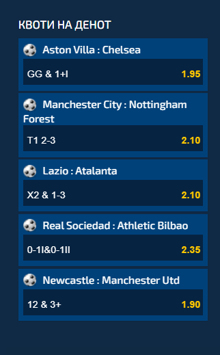 Првиот предлог е да одиграте дека на Астон вила – Челзи двата тима ќе постигнат гол и притоа дека ќе има гол во првото полувреме. Квотата е 1.95.