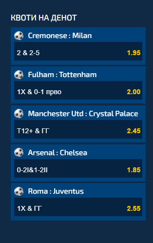 За Арсенал – Челзи предлогот е да уплатите дека во прво полувреме ќе има максимум два гола, а во второ 1-2 гола. Квотата е 1.85.