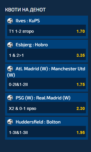 Вреди да се обидете и со квотата од 1.75 за играта дека на Атлетико Мадрид – Манчестер јунајтед од женската Лига на шампиони ќе има 0-2 гола во прво и 1-2 гола во второ полувреме.