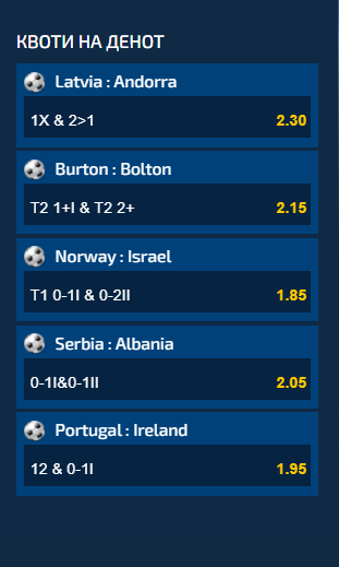 Првиот предлог е со најголема квота од 2.30 и тоа за играта дека Летонија нема да загуби дома од Андора и притоа во второто полувреме да има повеќе голови отколку во прво.