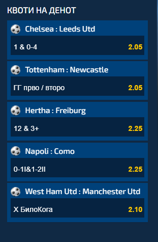 Последниот предлог во понудата е со квота 2.10, а ќе биде добитен ако на Вест Хем – Манчестер јунајтед биде нерешено на полувреме или на крај.