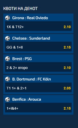 Последниот петти предлог е за Бенфика – Арука, квотата на денот е 2.15, а ќе биде добитна ако има гол во прво полувреме и 4+ голови на целиот меч.