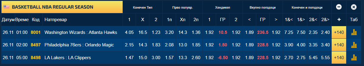 Три меча се играат вечерва во НБА-лигата, а делува дека два треба да бидат „сигурица“. Вашингтон визардс има очаен старт само со една победа и дури 15 порази. Волшебниците на свој терен се очајни без ниту една победа од шест меча, а вечерва пред своите навивачи ја дочекуваат Атланта. Јастребите се одлични и сезонава, на гости имаат осум победи во 11 средби, па не случајно се големи фаворити за победа во Вашингтон.