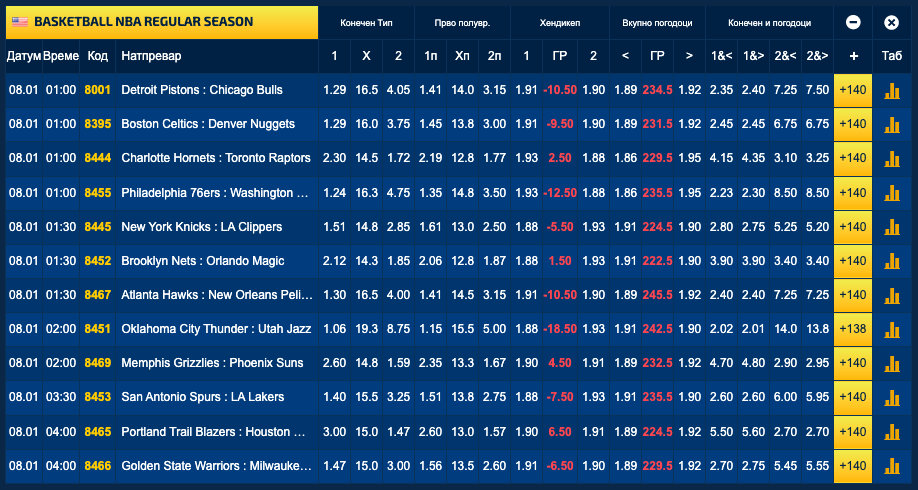 На осум од 12-те меча се очекуваат победи на домашните екипи, а гостите би требало да победат на четири натпревари според квотите во Sport Life. Лидерите на двете конференции, Детроит и Оклахома се меѓу големите фаворити за победа на домашен терен, а Денвер без Никола Јокиќ е тотален аусајдер на гостувањето кај Бостон.