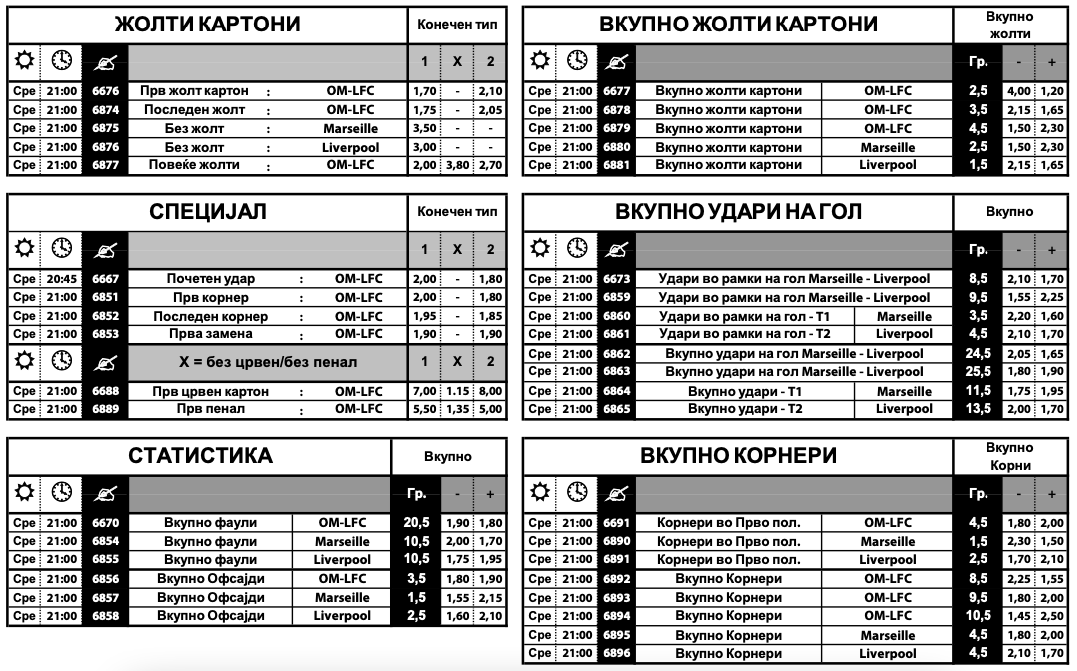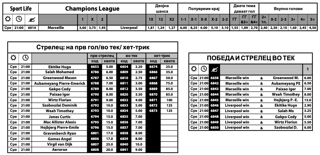Специјалната понуда на Sport Life за мечот на Марсеј и Ливерпул од Лигата на шампионите содржи стотици игри и комбинации на кои може да си го пробате знаењето, но и среќата.