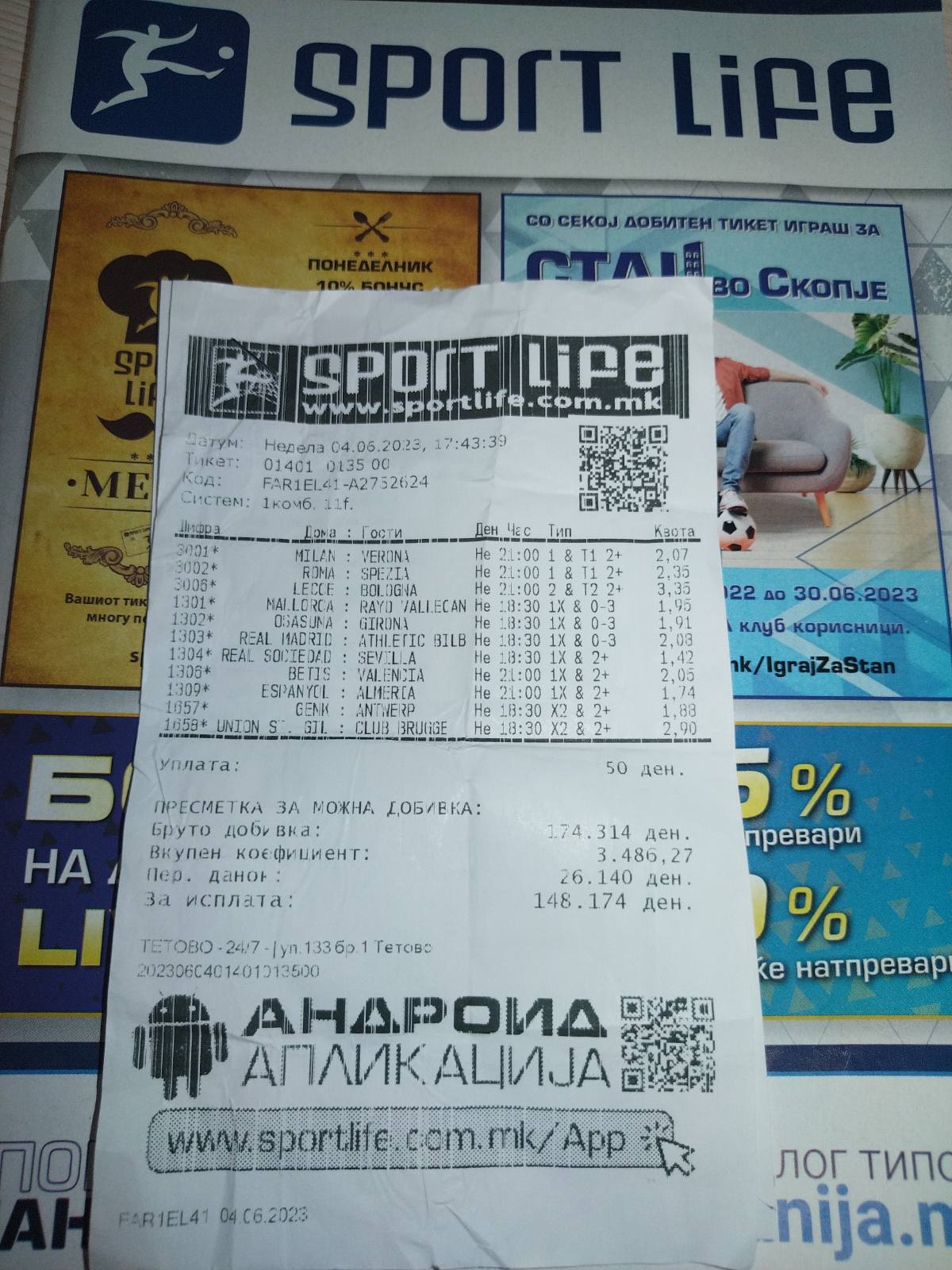 Тетовец во објект на Sport Life со уплата од 50 денари, погоди 11 натпревари, меѓу кои беа и двата меча од белгиската Жупилер лига и заработи 174.314 денари бруто.