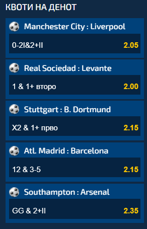 Викендот започна, а тоа е знак за многу возбудувања и неизвесност. Во денешната понуда на Квоти на ден има пет многу интересни натпревари, а ако се одиграат понудените комбинации, се добива вкупен коефициент од 44.53.