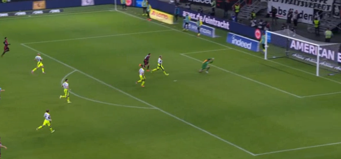 Во 68 минута Борусија поведе со 2:1, но домаќините не се предадоа. Напрво во 71 минута израмнија на 2:2, а потоа следуваше вистинско шоу во судиското надополнување. Со голот на Дауд во 90+2 минута Ајнтрахт поведе со 3:2 и се чинеше дека домаќините ќе ги освојат трите бода.