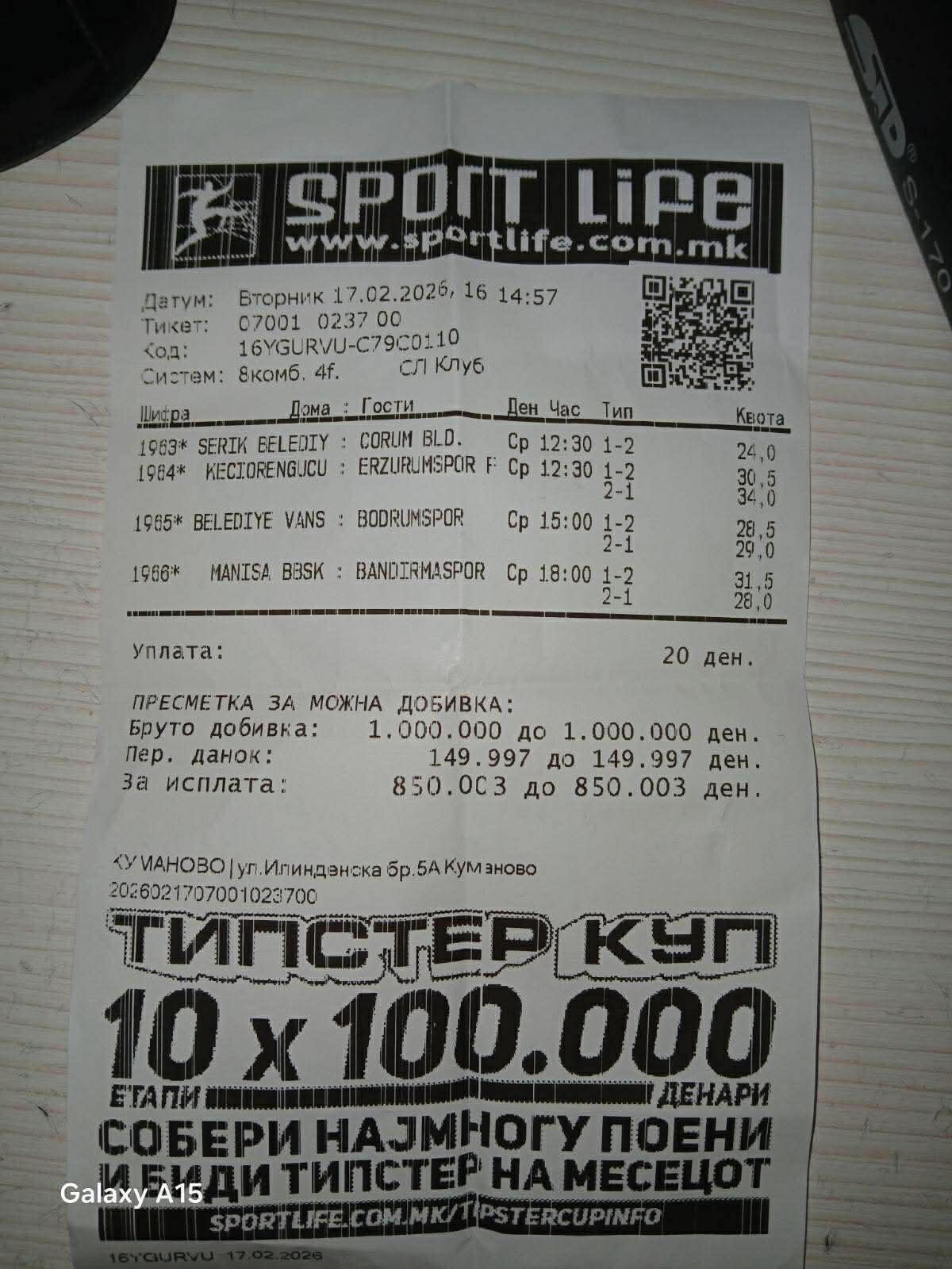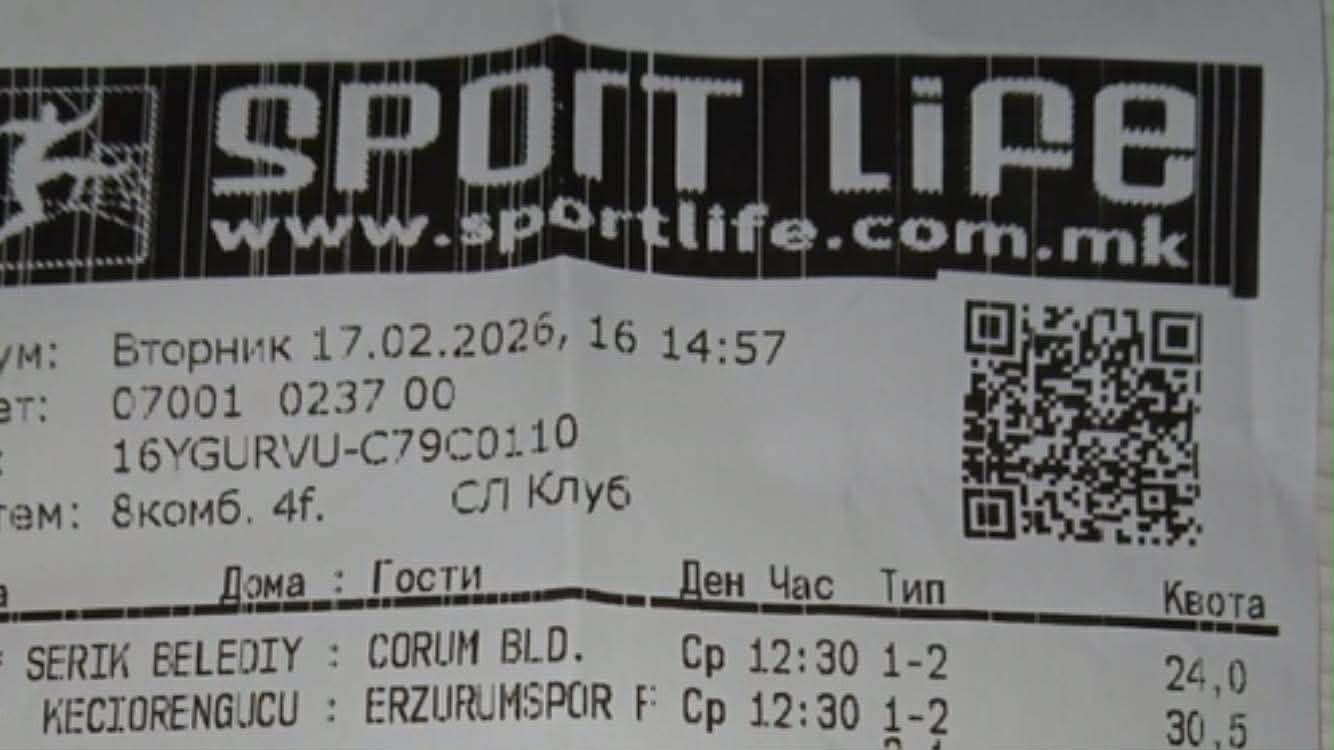 На тикет уплатен во Куманово, одиграно е дека на четири меча кои се играа во Турција, ќе има пресврти, односно „еден во два“ или „два во еден“. Три средби се од втората турска лига, а еден од пониските лиги. Овој тикет е уплатен на минимални 20 денари, а добивката е максимална и изнесува ЕДЕН МИЛИОН ДЕНАРИ.