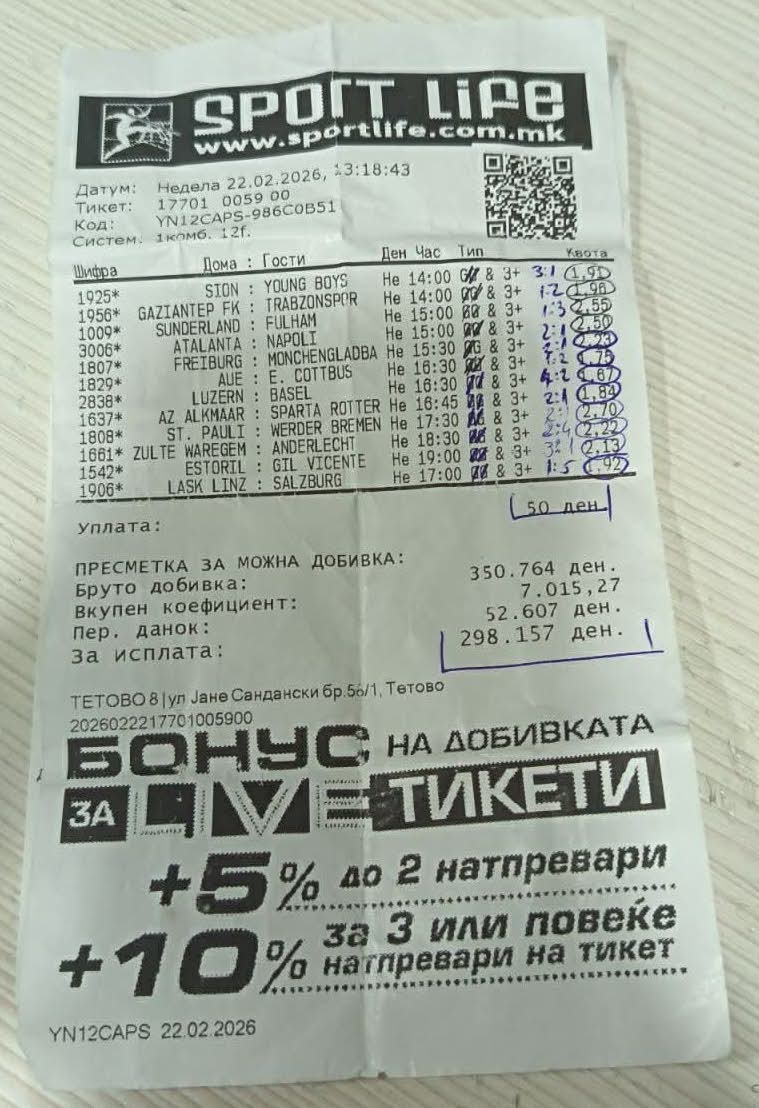 Мајсторски одигран тикет во Тетово донесе речиси 5.000 евра нето-добивка со уплата само од 50 денари на 12 натпревари.