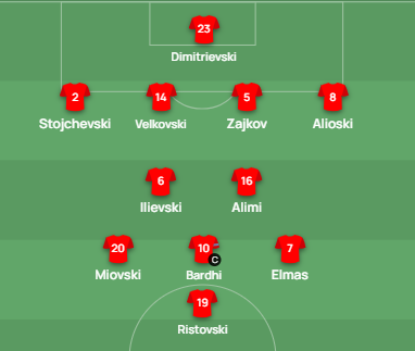 Селекторот Благоја Милевски го остави Димитриевски на голот, во одбраната се Стојчевски, Велковски, Зајков и Алиоски, а пред нив во средината Илиевски и Алими, па формацијата ќе биде 4-2-3-1.