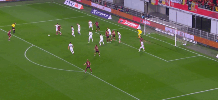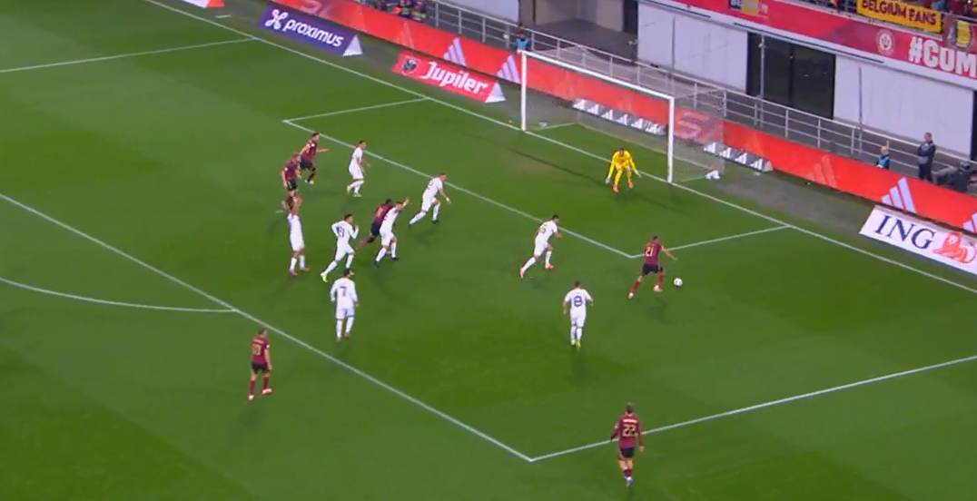 Белгија целосно доминираше во првото полувреме. Домаќините постојано напаѓаа, а за Македонија не остана ништо друго освен да се брани. Во некои ситуации, Македонија со сите 11 играчи беше во својот шеснаесетник, но тоа беше одлично и ѕвездите на Белгија не можеа да го пробијат македонскиот бункер.