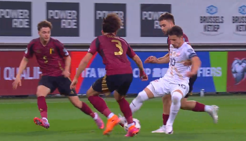 Македонија одолеа на нападите на Белгија во првото полувреме и игра 0:0 по 45 минути, на мечот кој се игра во Гент, во рамките од квалификациите за пласман на Светско првенство 2026 година. Ова е резултат кој одговара на Македонија и евентуално еден освоен бод на крајот ќе значи дека Македонија ќе остане на првото место во групата.