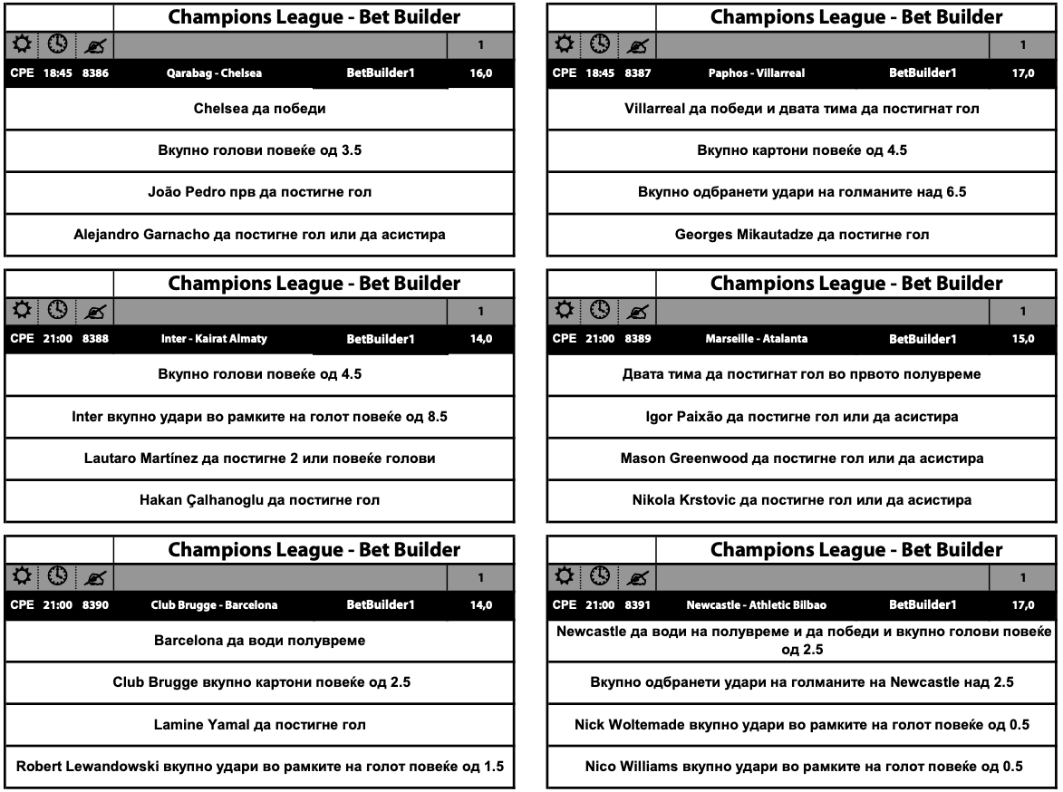Втората половина од четвртото коло на Лигата на шампионите се игра вечерва, а тоа значи дека во Sport Life повторно има максимално набилдани квоти, кои денес достигнуваат и до 32.00.