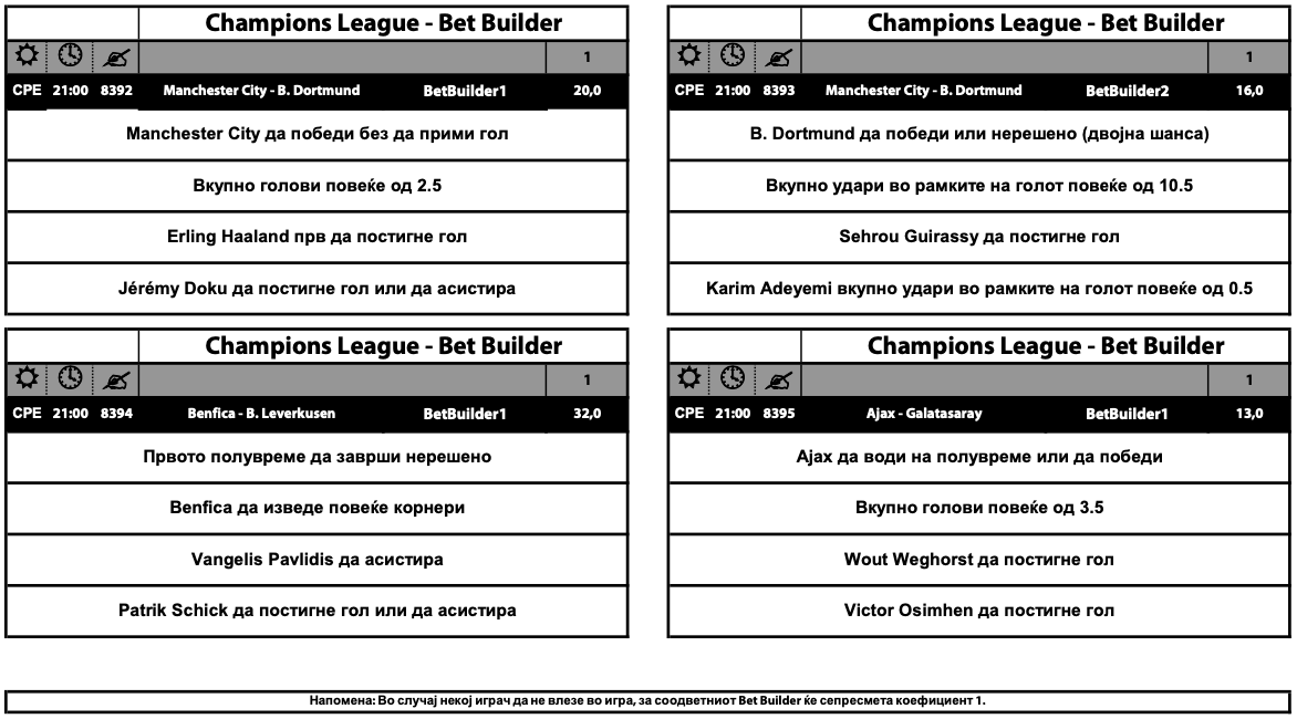 Најголемата квота во Бет билдерот е 32.00 и е за мечот на Бенфика и Баер Леверкузен, додека за најинтересниот натпревар вечерва, оној помеѓу Манчестер сити и Борусија Дортмунд, квотите се 16.00 и 20.00.