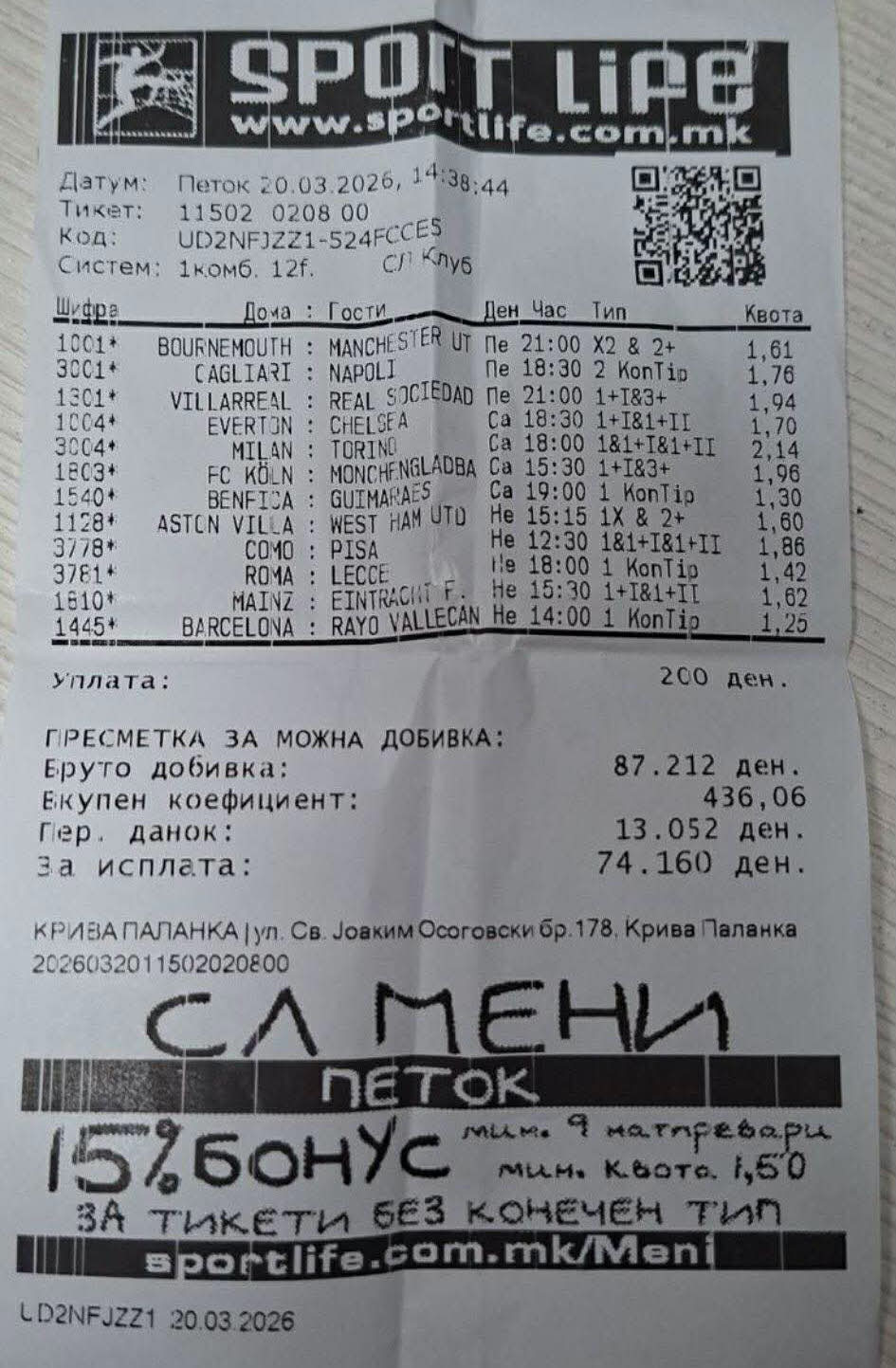 Во Крива Паланка беше одигран тикет со 12 меча и влог од 200 денари, а добивката беше 74.160 денари нето. Дванаесетте натпревари беа распоредени од петок до недела, а погодените квоти се движеа помеѓу 1.25 и 2.14.