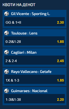 Петте мечеви од најатрактивните европски лиги кои се играат денеска се дел од понудата во Квотите на денот. Доколку сите пет понудени комбинации ги одиграте на еден тикет, вкупниот коефицинет кој ќе го добиете е 42.42.
