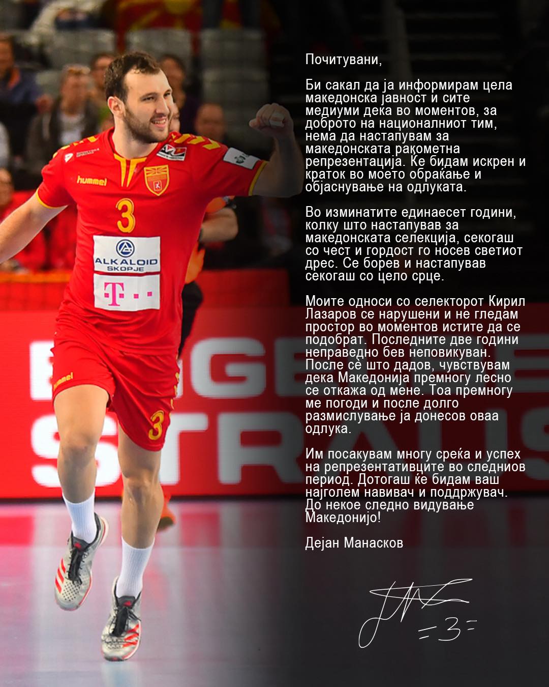 „Би сакал да ја информирам цела македонска јавност и сите медиуми дека во моментов, за доброто на националниот тим, нема да настапувам зза мкедонската ракометна репрезентација. Во изминатите 11 години колку што настапував за македонската селекција, секогаш со чест и гордост го носев светиот дрес. Моите односи со селекторот Кирил Лазаров се нарушени и не гледам простор во моментов тие да се подобрат. Последните две години неправедно бев неповикуван. После сè што дадов, чувствувам дека Македонија премногу лесно се откажа од мене. Тоа премногу ме погоди и после долго размислување ја донесв оваа одлука. Им посакувам многу среќа и успех на репрезентативците во следниов период. Ќе бидам ваш најголем навивач и поддржувач. До некое следно видување Македонијо“, напиша Манасков.
