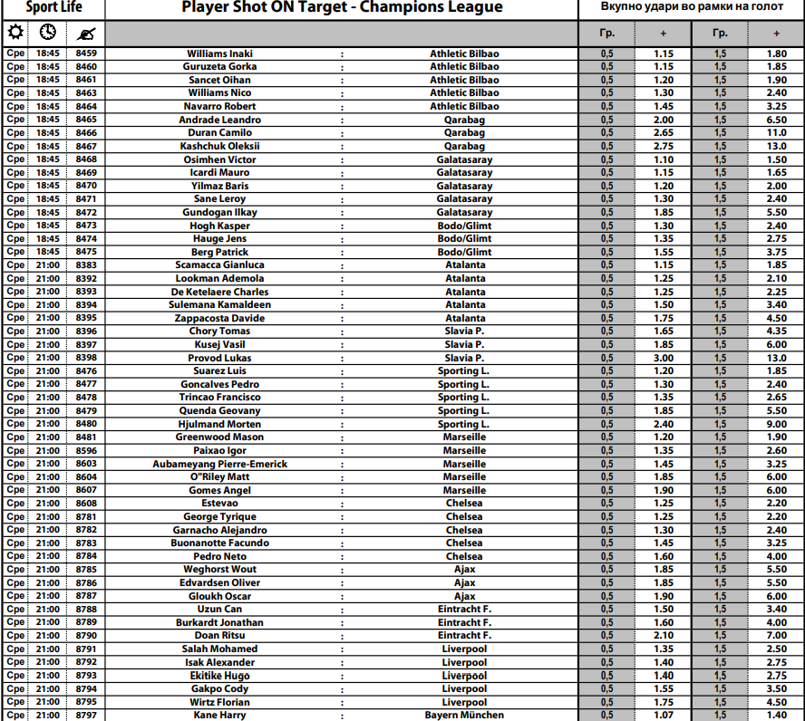 Виктор Осимен да има над 1,5 шутеви во рамките на голот на Бодо/Глимт е со квота од 1.50. Франциско Тринкао да има два или повеќе шутеви во рамките на голот на Олимпик Марсеј е со квота од 2.65.