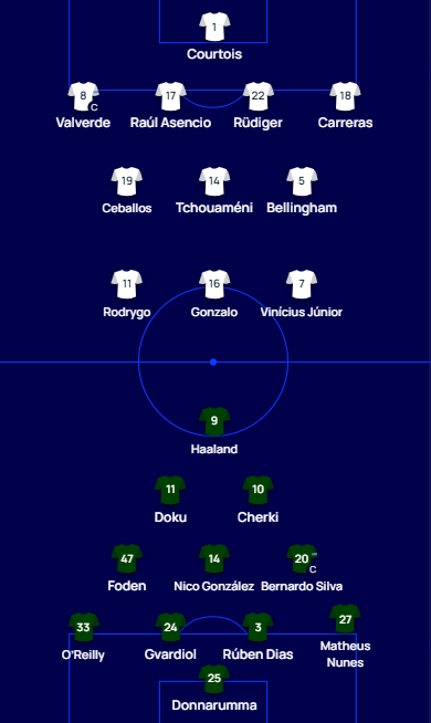 Формацијата на Реал е 4-3-3, а мало изненадување е што шанса од прва минута добиваат Гонзало и Родриго, додека го нема Ѓулер кој не е „компатибилен“ со Белингам и кога се заедно на терен, тимот лошо функционира. Инаку, според некои добро информирани шпански медиуми, Реал сепак нема да го отпушти Чаби Алонсо ако загубат вечерва од Сити и ќе се чека исходот на Суперкупот на Шпанија во јануари, кога Реал би бил покомплетен од тоа што е сега.