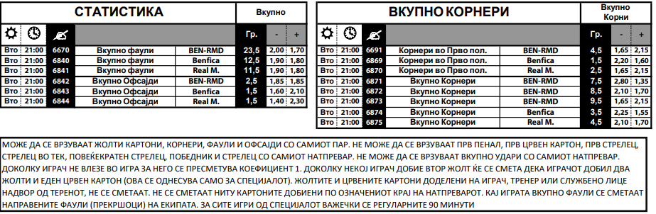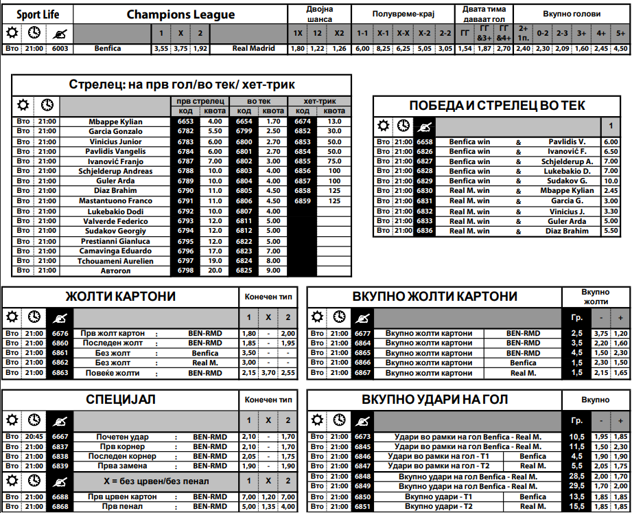 Овојпат се игра двомеч, нокаут-систем и сигурно ќе има многу повеќе калкулации. Сепак, јасно е дека најголем фаворит за стрелец на првиот гол е Килијан Мбапе, кој прв ја затресе мрежата и на дуелот минатиот месец. Гонзало Гарсија и Винисиус јуниор се меѓу фаворитите за стрелци за Реал, додека Бенфика адутите ќе ги бара кај Павлидис, Ивановиќ… Вкупно 15-мина фудбалери се во комбинација за стрелец, а првиот погодок да е автогол, квотата е дури 20.