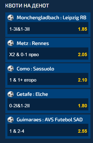 Пет интересни меча од пет различни атрактивни европски првенства се дел од понудата во Квотите на денот. Доколку сите пет комбинации ги одиграте заедно на еден тикет, вкупниот коефициент кој ќе го добиете е 36.55.