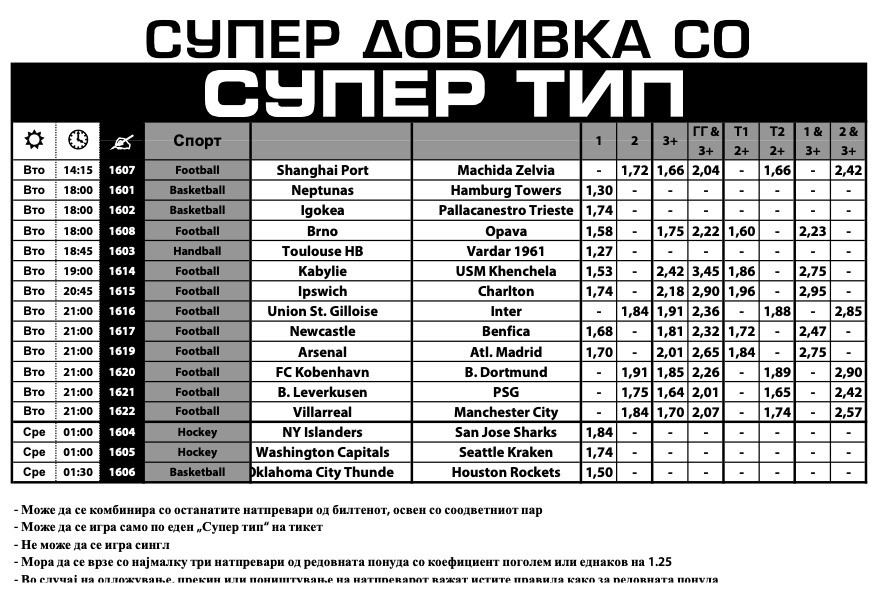 Помеѓу фудбалските натпревари најинтересни се оние од Лигата на шампионите, а зголемени квоти може да се најдат за победите на Интер, Њукасл, Арсенал, Борусија Дортмунд, ПСЖ и Манчестер сити.