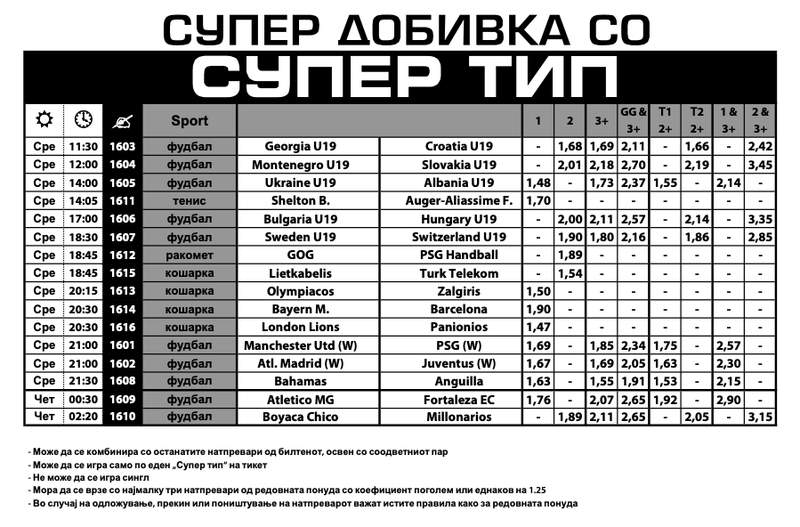 Првиот натпревар започнува веќе во 11:30 часот и е од квалификациите за селекции до 19 години, исто како и следните два. Тоа значи дека треба да побрзате и што е можно порано да ги посетите уплатните места на Sport Life, да одберете еден пар од Супер типот и на тој начин да си ги зголемите добивките на вашите тикети.
