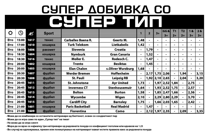 Во Супер типот за вторник може да најдете зголемени квоти на вкупно 48 игри.