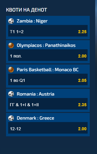 Денешните пет предложени Квоти на денот во Sport Life прават вкупен коефициент од 43.35, а поединечно, сите пет квоти се 2.00 или поголеми, што ги прави атрактивни за играње.