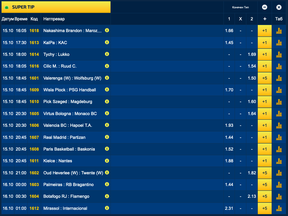 Натпревари од пет различни спорта се дел од понудата со зголемени квоти на Sport Life, Супер типот. И покрај разновидноста, фудбалот е најброен со пет натпревари, а кошарката има еден натпревар помалку, односно четири меча помеѓу понудените 16.