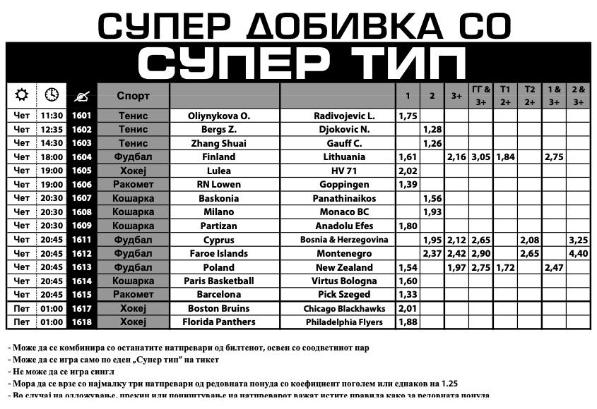 Натпревари од пет различни спорта се дел од понудата со зголемени квоти на Sport Life, Супер типот. Најбројни се фудбалот и кошарката, со по четири натпревари, следуваат хокејот и тенисот со по три, а два меча се од ракометот.