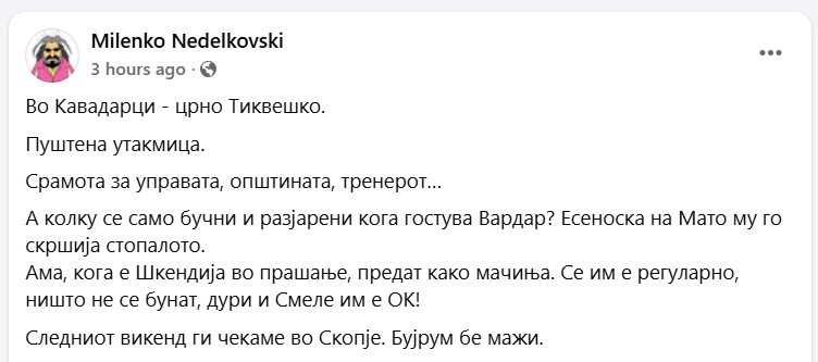 Првиот човек на Вардар, Миленко Неделковски денеска преку профилот на социјалните мрежи имаше реакција, посебно кој кавадарчани и Тиквеш. Неделковски пишува дека фудбалерите на Тиквеш „предат како мачиња“ кога играле против Шкендија, но дека не е така кога играат против Вардар. Тој потсетува дека есеноска Мато заработил скршеница на стопалото токму на дуелот против Тиквеш.