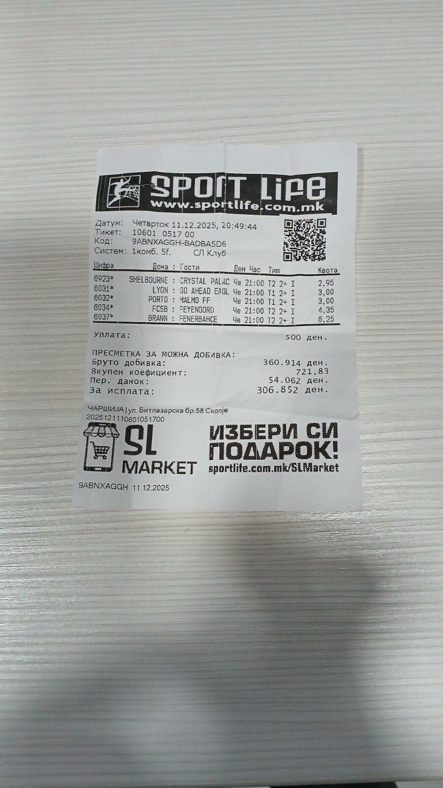 Одличен тикет со мечеви од европските купови на кои се барале голови има и во Скопје. Во објект на Sport Life во Старата чаршија уплатени биле 500 денари дека Кристал палас, Лион, Порто, Феенорд и Фенербахче ќе постигнат два или повеќе голови во првото полувреме.
