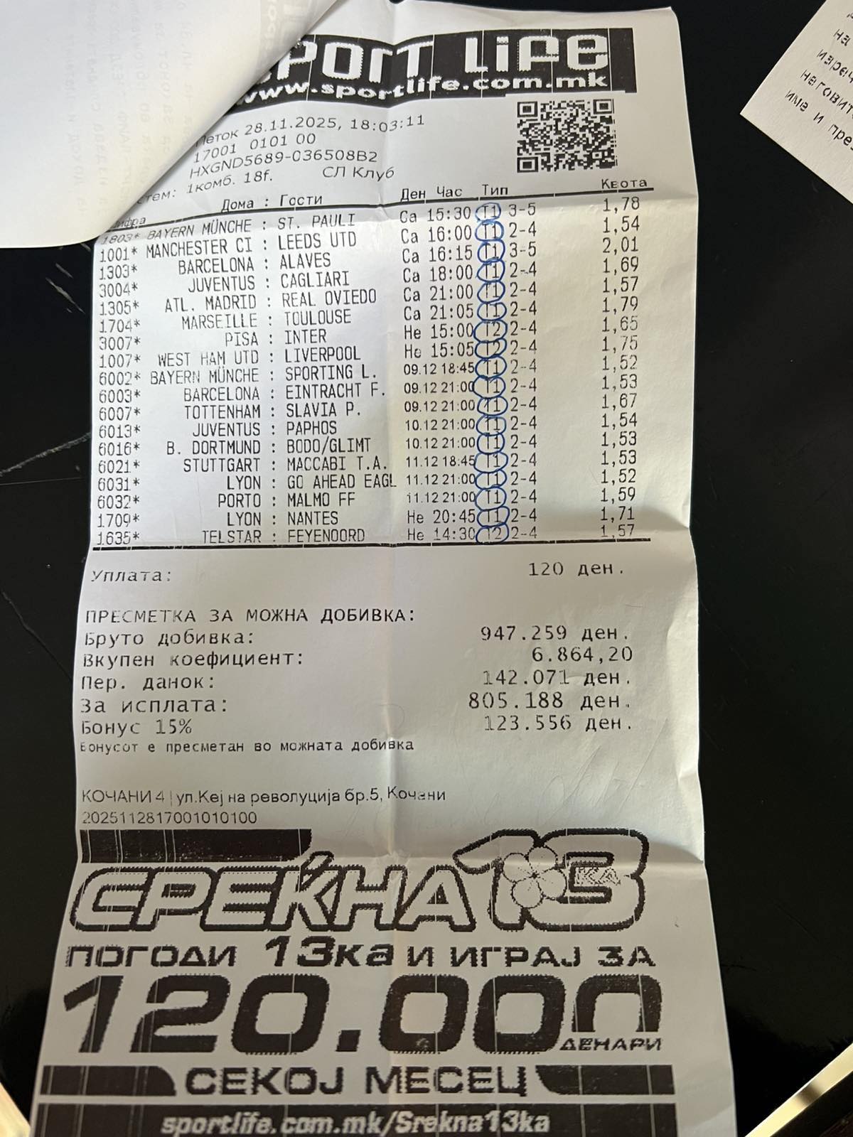 Овој „споровозен“ тикет има мечеви кои се играа на крајот на ноември, но има и три меча кои се играа синоќа и се чекаше огромната добивка откако излегоа првите 15 пара. Потребно беше од два до четири гола да постигнат Штутгарт, Лион и Порто и тие го направија тоа.