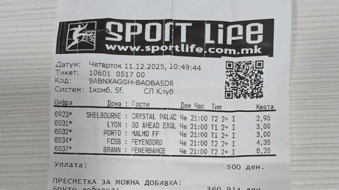 Одличен тикет со мечеви од европските купови на кои се барале голови има и во Скопје. Во објект на Sport Life во Старата чаршија уплатени биле 500 денари дека Кристал палас, Лион, Порто, Феенорд и Фенербахче ќе постигнат два или повеќе голови во првото полувреме.