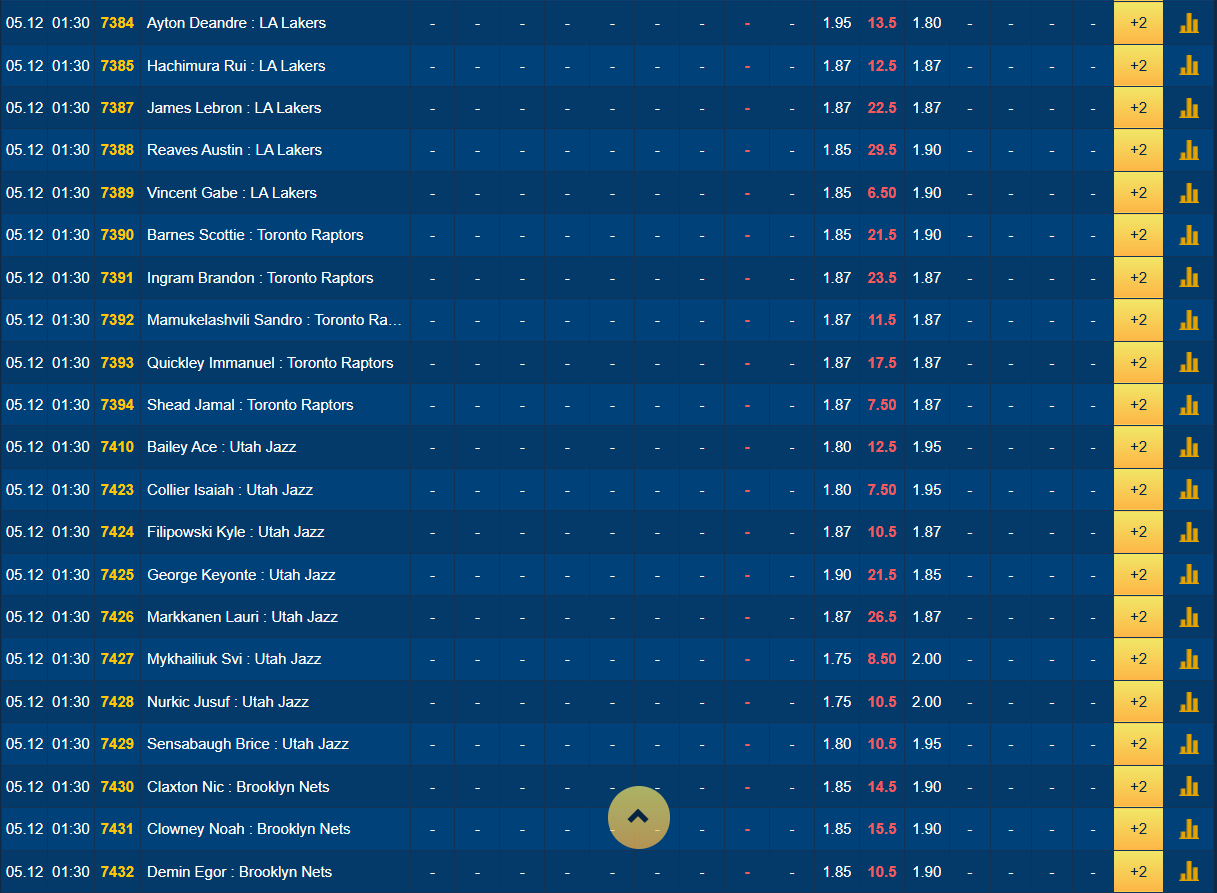 Во понудата за „плус-минус“ поени на играчите кои вечерва треба да бидат на теренот се дури 54-ица кошаркари. Дерик Вајт да биде во „плус“ мора да надмине 21,5 поени, За Леброн Џејмс границата е поставена на 22,5 поени, додека за првата ѕвезда на Јута џез, Лаури Маканен, границата е на 26,5 поени.