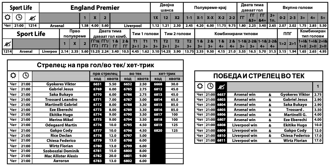 Триумфот на „црвените“ може да се комбинира со Екитике, Гакпо, Кјеза и Вирц, а со оглед на фактот дека Арсенал е фаворит со квота од 1.58 за победа, квотите за комбинации на „топчиите“ се движат помеѓу 2.75 и 4.00.