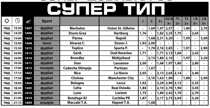 Атрактивна и привлечна е денешната Супер тип понуда на Sport Life, во неа има 13 фудбалски мечеви меѓу кои и Челзи – Манчестер сити, а посебна убавина внесува и тенискиот спектакл Алкарас – Синер, финалето на Мастерсот во Монте Карло кое ќе одлучи кој од нив двајца од утре ќе биде прв на АТП листата.