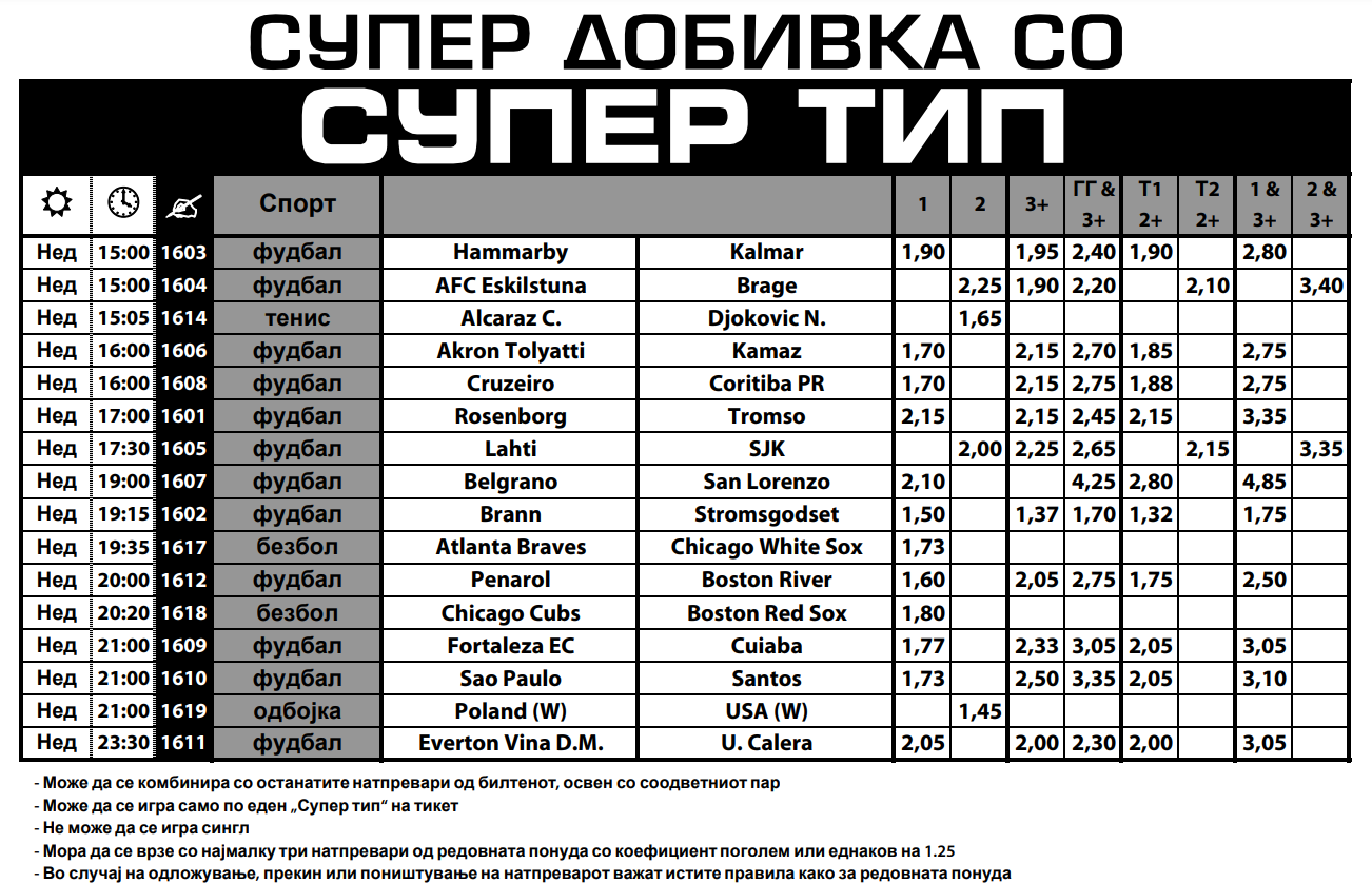 Од фудбалскиот дел, има примамлива понуда. Хамерби е фаворит за победа над Калмар, а 2.15 квота е триумф на Розенборг против Тромсо. Неколку меча и од дуелите кои ќе се играат во Јужна Америка, па на вас останува да го одверете фаворитот кој ќе ви донесе зголемена добитна квота.