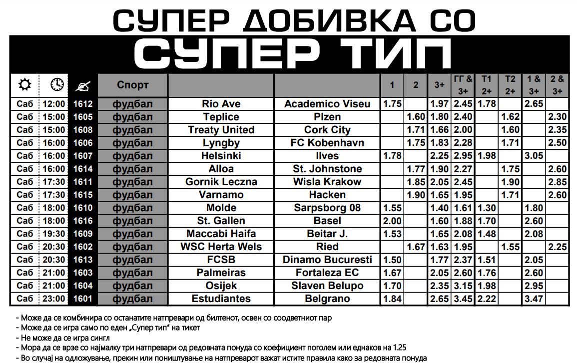 Тоа што е карактеристично за денешната понуда е дека во најголем број се работи за мечеви на кои еден од тимовите е во улога на фаворит. Во таква ситуација, квотите се одлични и може да го одберете вашиот добитен избор.