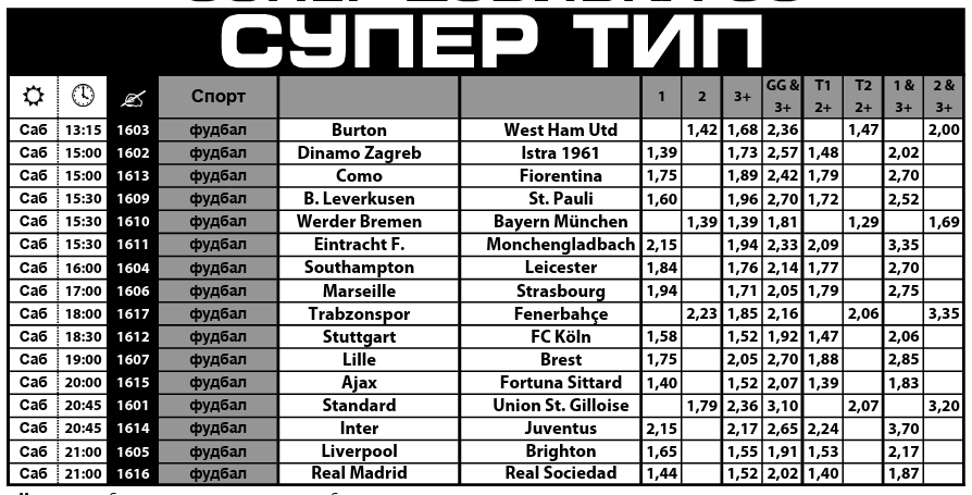 Денешниот Супер тип на Sport Life е составен со џокери за 16 фудбалски натпревари на кои повеќе или помалку има јасни фаворити за победа.