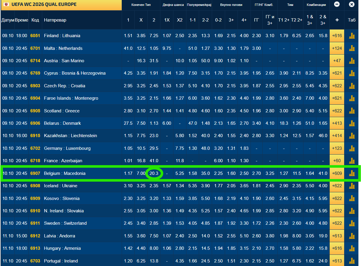 Можеби како никогаш досега, квотата за победа на Македонија е неверојатна и изнесува 20.3. Тоа значи дека само 50 денари влог, можната добивка за победа на Македонија е над 1.000 денари.