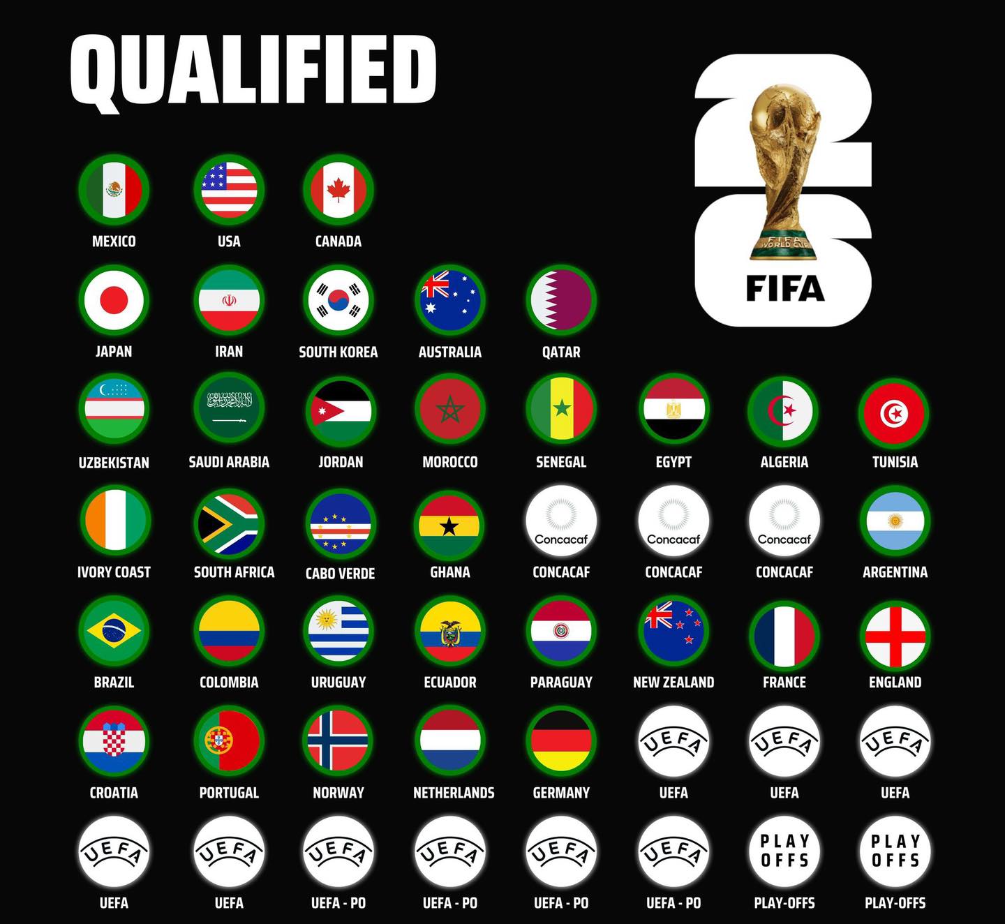 Преостанатите пет места ќе ги пополнат три репрезентации од Северна Америка, чии квалификации завршуваат ноќта вторник кон среда по македонско време, како и две репрезентации од интерконтиненталниот плеј-оф кој ќе се игра во САД непосредно пред почетокот на Мундијалот.