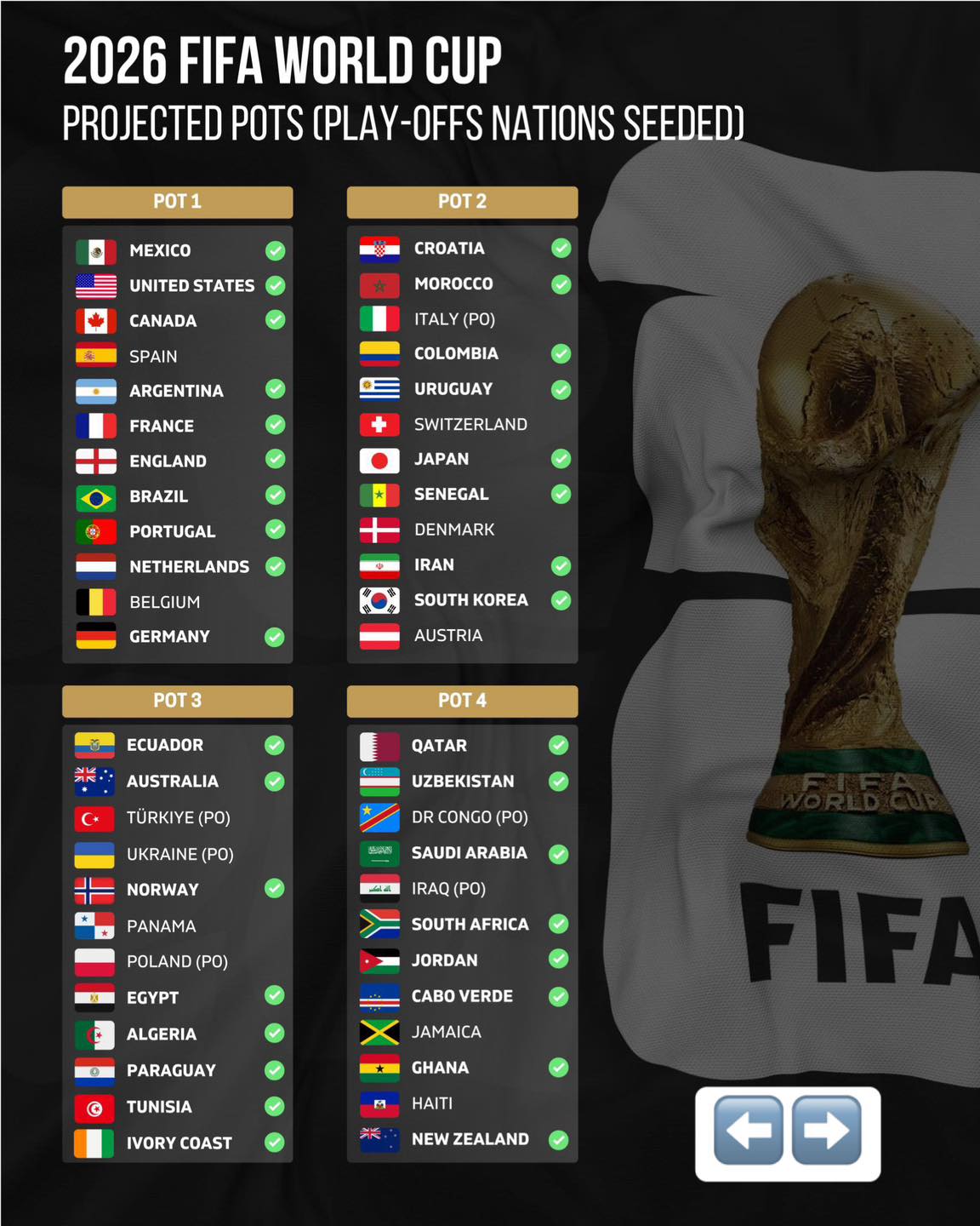 Веќе се познати и 12-те селекции кои ќе бидат носители во ждрепката. Тоа се трите селекции домаќини – САД, Канада и Мексико, потоа бранителот на трофејот, Аргентина, а неевропска селекција помеѓу овие 12 е само уште Бразил. Од Европа носители ќе бидат и Шпанија, Франција, Англија, Португалија, Холандија, Белгија и Германија.