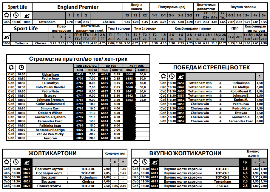 Дури седум квота е Тотенхем да добие прв црвен картон, а за гостите да имаат исклучување е коефициент шест. По 5.50 квота е за двете екипи да имаат прв пенал.