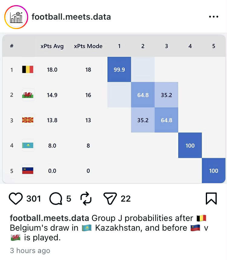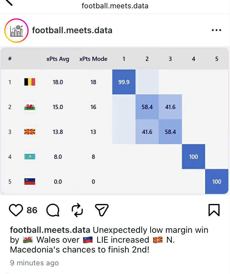 Статистичарите пресметаа дека Велс има 58,4% шанси да дојде до второто место во групата, иако за такво нешто потребна им е победа над Македонија. За разлика од нив, на Македонија ѝ е потребен само бод (зошто да не и победа), но и покрај тоа нашите шанси се 41,6%.