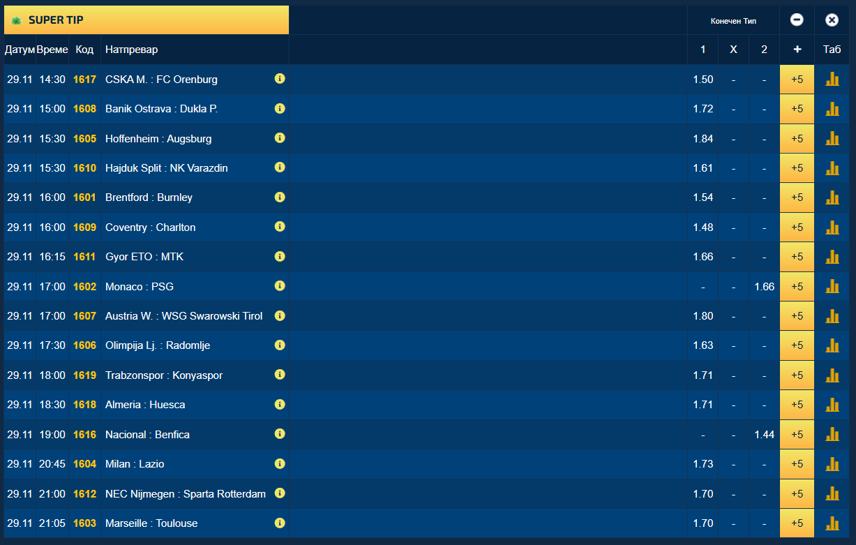 Фудбалот доминира во денешната понуда на Супер типот и има зголемени коефициенти на 16 натпревари, сите од европските првенства. Интересно е тоа што на само две средби, гостинскиот тим се смета за фаворити и има зголемена квота.